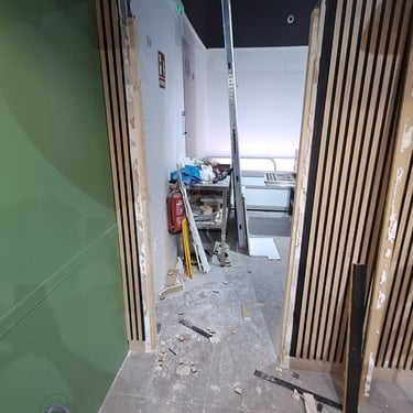 Se realizaron obras derrumbe de tabiques existentes, Trabajos de fontanería en general , electricidad con tablero principal adecuado para líneas independientes y hornos trifásicos.